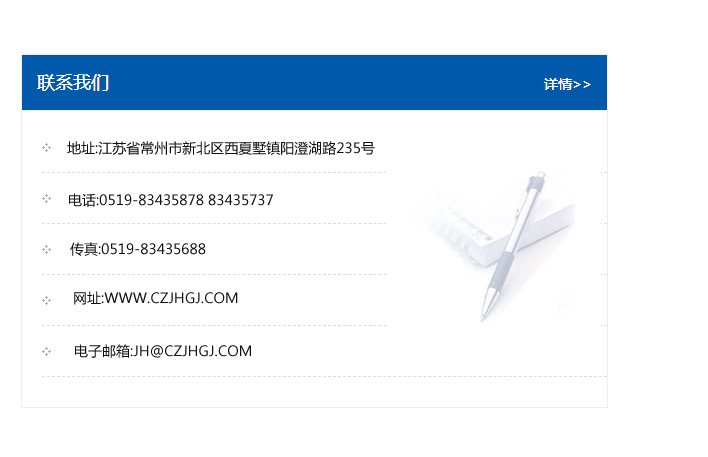 地址:常州市新北區友邦商務大廈1幢16、17層  電話:0519-85101652  傳真:0519-85112595  郵編:213022  網址:www.cz-jiayue_cn.jnhxwh.com  郵箱:xiajifengaa@163.com